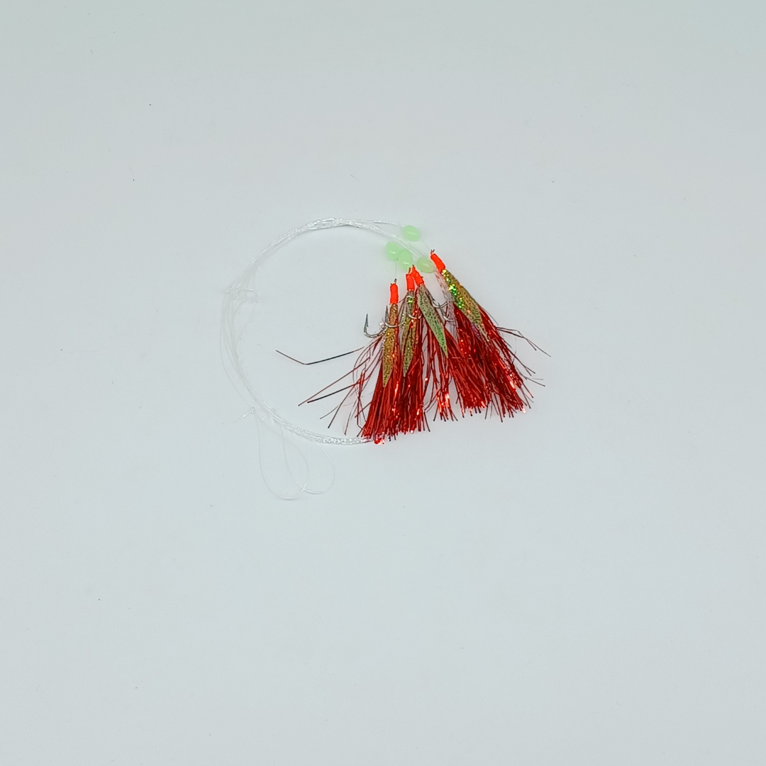Feather rigged  pour la pêche à la traîne et la pêche en profondeur avec 5 hameçons de taille 6 montés sur aurores, guirlandes, plumes rouge, ligatures rouges et perles phosphorescentes.